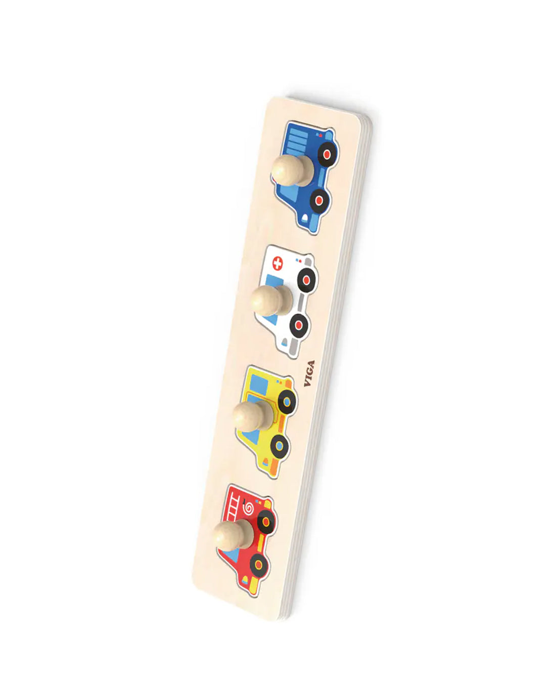 • Flat peg puzzle featuring 4 different types of vehicles